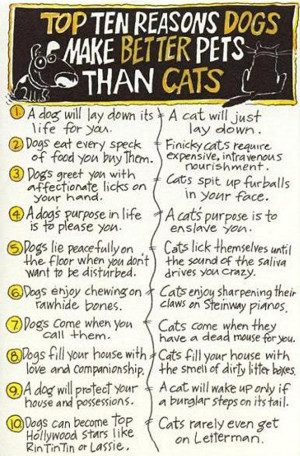 They are a good first pet for children. Dogs actually do real jobs to help humans, cats occasionally make slaves of idiots. Dog lovers are usually drawn to the companionship a dog provides. Here are 10 solid reasons why dogs are far better than cats. Irrespective of their size or inherent characteristics;